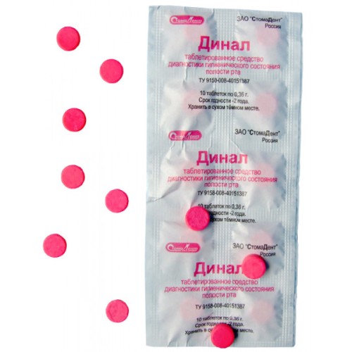 Таблетки для диагностики состояния ротовой полости ДИНАЛ производства СтомаДент – средство, предназначенное для выявления мягкого налета на зубах. Применяется для проверки качества выполненной работы по очистке зубной полости.